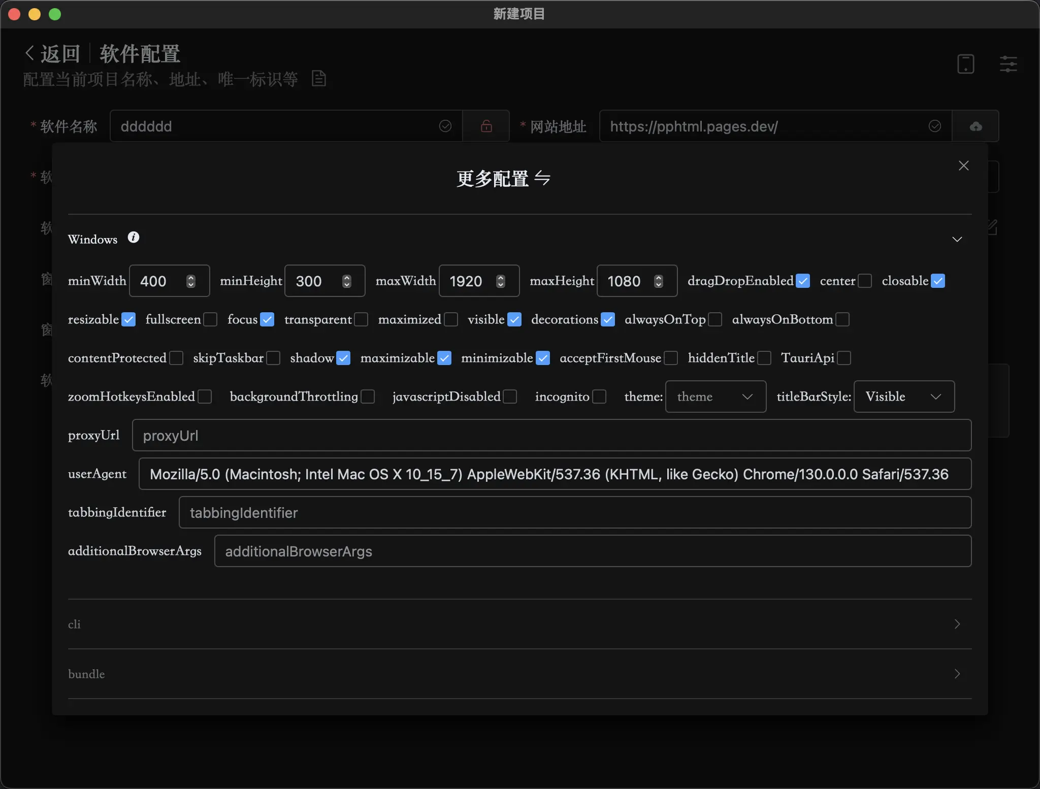 这里主要将 tauri 的配置可视化了,直接通过点击或者下拉操作即可实现自定义配置,比如全屏显示,或者开启调试模式等,如果你要使用桌面端相关的 APi,一定要勾选 TauriApi 这个选项,否则不生效!