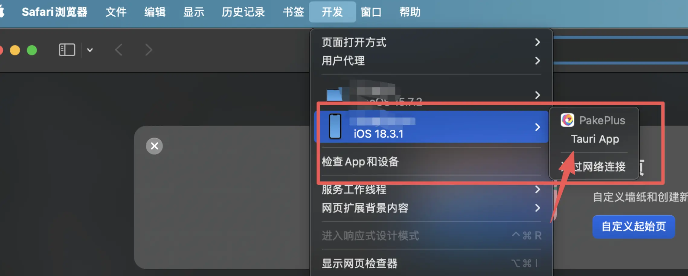 ios 连接 mac 后,打开 safari 浏览器,在工具栏开发 -> 找到自己的设备 -> 对应的 APP: