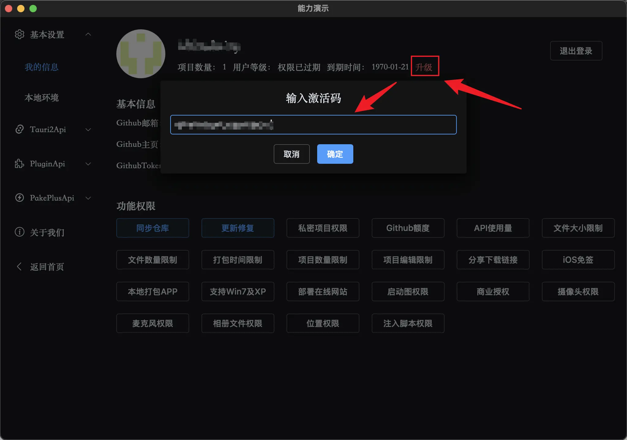 然后点击升级按钮,填入激活码:
